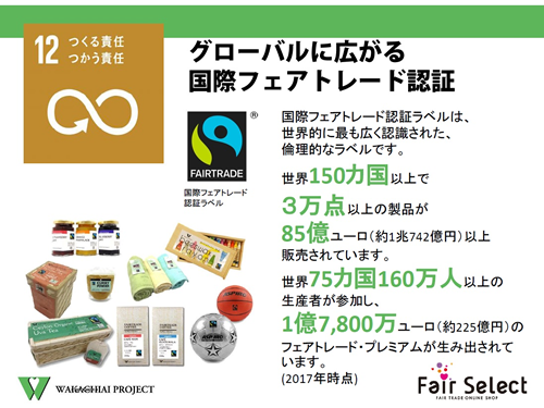 また、フェアトレード・プレミアムは生産者とその家族のために省エネルギーの暖房器具を設置することなどにも使われ、2015年には温室効果ガスの削減のための「フェアトレード・カーボン・クレジット」の仕組みが作られました(目標7)。生産者・労働者には、安心して働くことのできる労働環境と賃金が保証されています(目標8)。生産者組合が公正な取引基準の元で、先進国の企業と対等に取引することで、国の産業を牽引し(目標9)、先進国に有利な関税制度の撤廃を働きかけています(目標10)。生産者の組織化によりコミュニティを強化し、フェアトレード・プレミアムによって地域の人々が集うコミュニティ施設も建設されています(目標11)。 そして、「国際フェアトレード認証ラベル」は世界で最も広く認知されている倫理的なマークと言われ、消費者が分かりやすくフェアトレード製品を選ぶことができるようになっています(目標12)。