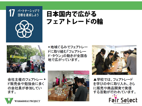 独自の有機バイオダイナミック農法により、環境に配慮した持続可能な農業を行い、品質の良い作物を育てています(スリランカ) 有機性廃棄物の再資源化や化学物質の適切な使用についてのトレーニング、輸出規制や販路開拓のためのトレーニングなどが行われています(タイ) 国家の貧困削減プログラムとして、マラウイの政府と砂糖製糖会社の共同によりフェアトレード砂糖生産者組合KCGが設立されました(マラウイ)。 日本で二番目のフェアトレードタウンになった名古屋市のイベント。熊本市・名古屋市・逗子市など、街ぐるみでフェアトレードに取り組むフェアトレードタウンの動きが広まっています。